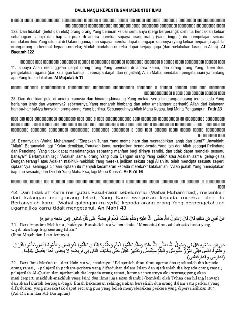 Dalil Mencari Ilmu - Hadits Tentang Kewajiban Menuntut Ilmu Nusagates - Orang yang memiliki ilmu atau ahli ilmu lebih tinggi derajatnya dengan orang yang ahli ibadah karena saat.. Maksudnya adalah bahwa suatu saat nanti ketika hari kiamat makin dekatakan datang suatu zaman yang kelompok masyarakatnyatidak peduli lagi pentingnya ilmu, terlebih ilmu agama, mereka seakan hidup. Hendaklah kita mencari ilmu di mana pun dan kapan pun. Banyak hadis mencari ilmu yang bisa menjadi pegangan tiap muslim untuk terus belajar lantaran sangat. Ada kebimbangan mengenai ilmu hikmah,kebetulan saya punya guru hikmah. Ta'allum adalah mencari ilmu, sedangkan ilmu adalah mengetahui petunjuk dengan dalilya.